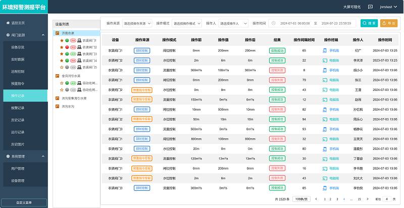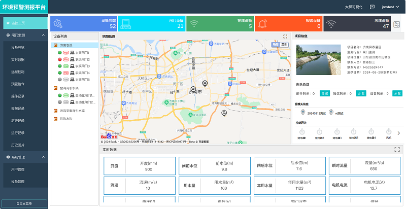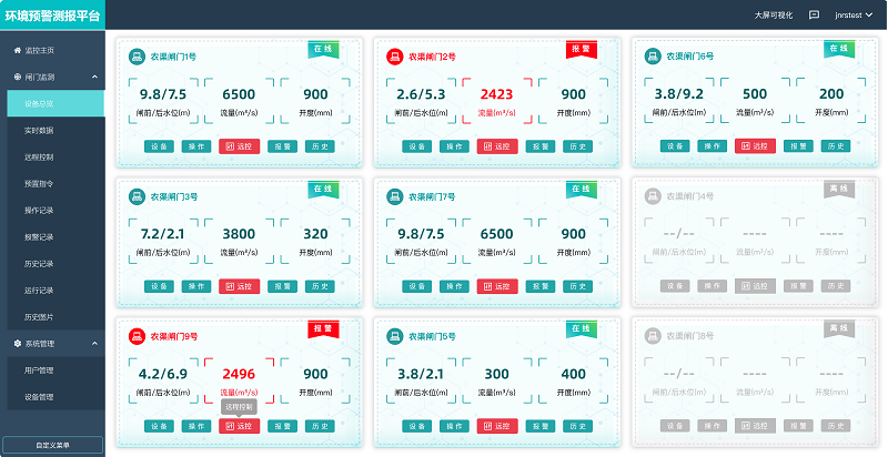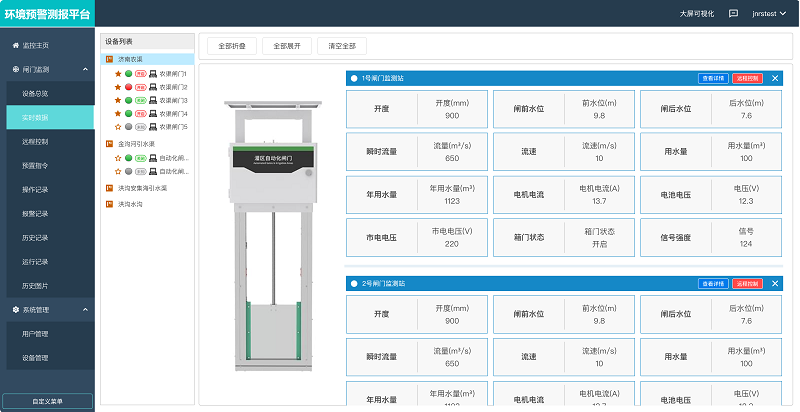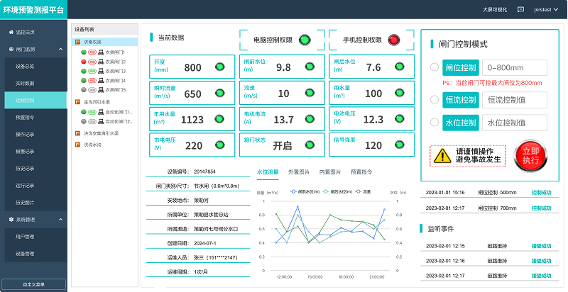 用户还可以在云平台中随时查看智能灌排系统的各项数据,如:闸门开度、闸前水位、闸后水位、瞬时流量、流速、用水量、年用水量等数据信息和视频画面,监控水流动态等,避免过度灌溉或缺水现象。除自动控制外,系统还支持手动控制闸门,更好的实现了管理的便捷化与实时化。
