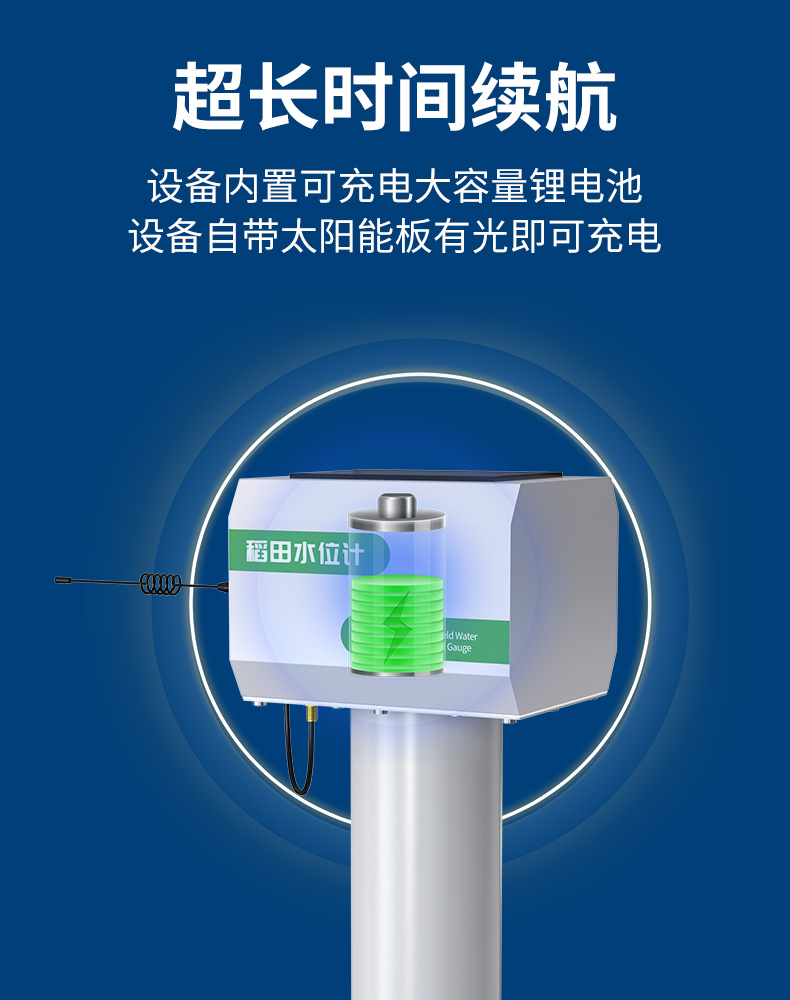 稻田水位计内置可充电大容量锂电池,拥有超强续航能力(7天),且自带太阳能供电系统,有光即可充电,不仅减少了人工维护还有效预防了因连续阴雨天无法充电而导致设备断电的情况发生,满足了用户户外长期使用需求。