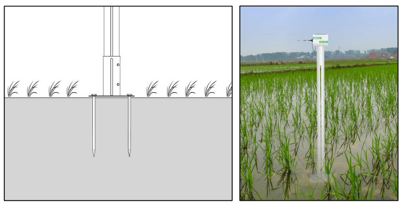 稻田水位计在安装时只需将底座与地面水平贴合安装即可,确保了稻田水位计在稻田中的固定深度达到了 1m 的标准水面,无需进行二次设置,使用更方便。
