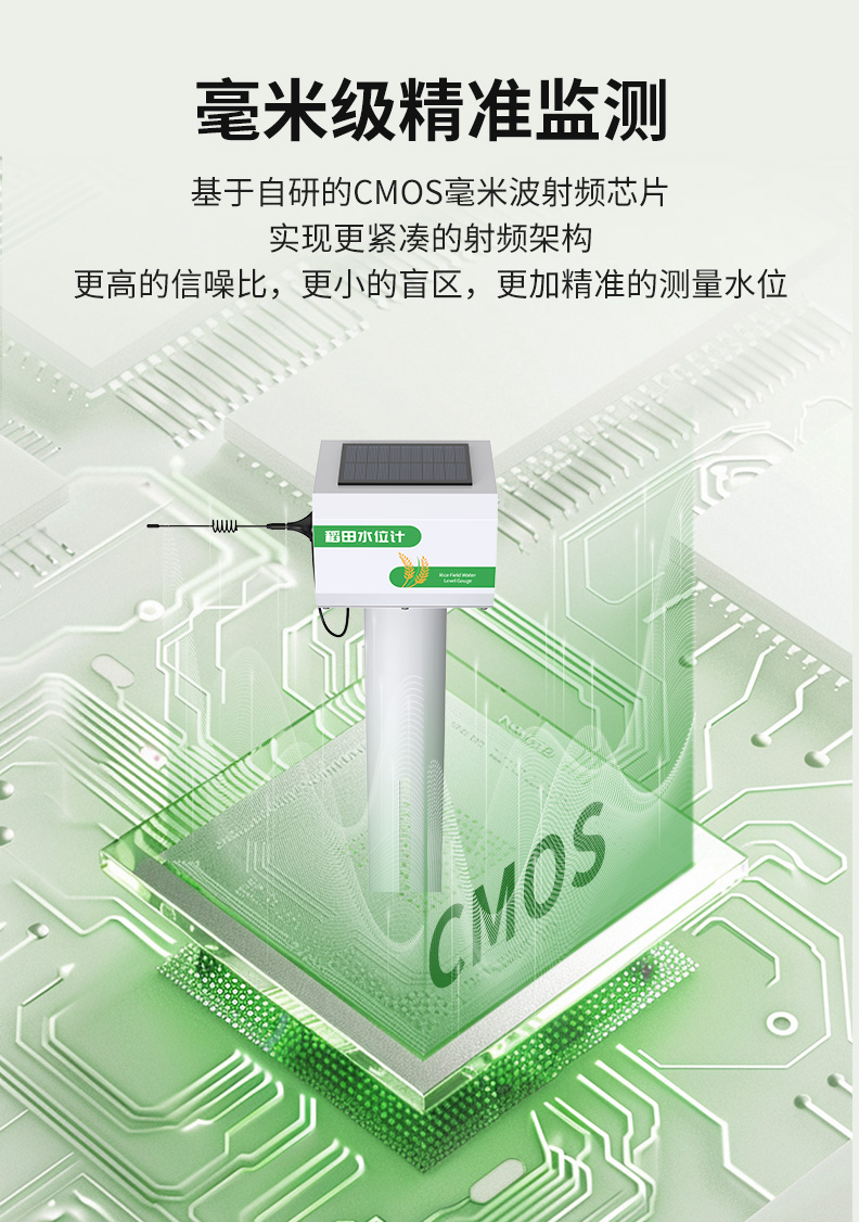 设备内置我公司自主研发的CMOS毫米波射频芯片,具有更紧凑的射频架构,实现了毫米级(±1mm)超高精度监测,能够精准捕捉田面水层的细微变化(如蒸发渗漏)。