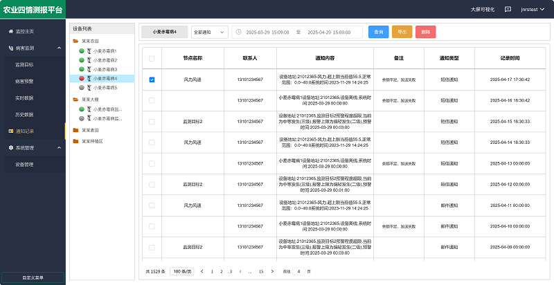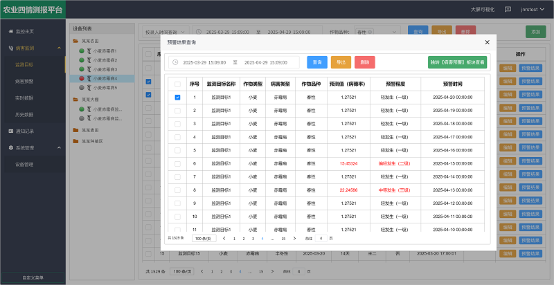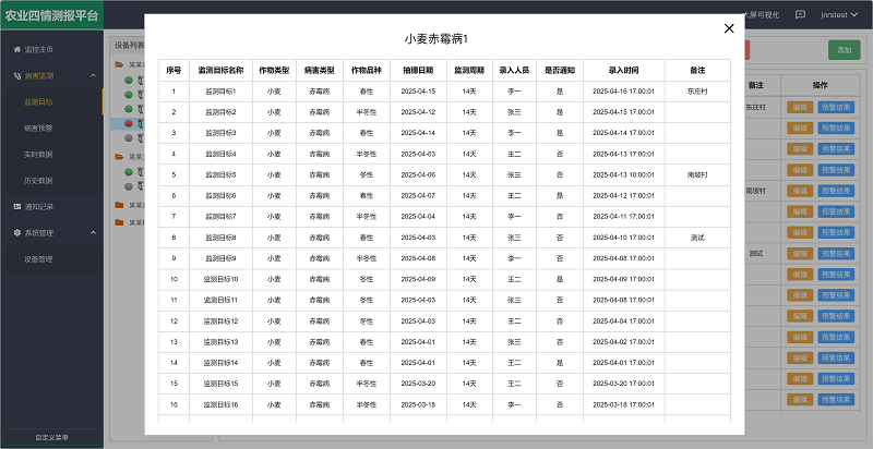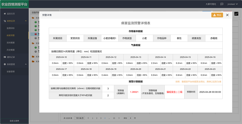 用户可以通过平台自定义设置监测目标,填写小麦品种(春性、半冬性、冬性)、生长周期(抽穗日期)及监测周期等,平台会根据内置算法自动生成生成《病害监测预警详情表》,内容包括气象数据、预测值和预警等级(由低到高依次为不发生/轻发生(一级)/偏轻发生(二级)/中等发生(三级)/偏重发生(四级)/大发生(五级))等,一旦预警等级超过上限,会通过数据变红、短信、语音、邮件的形式在指定时间向用户进行预警,确保用户获取最新预警信息。