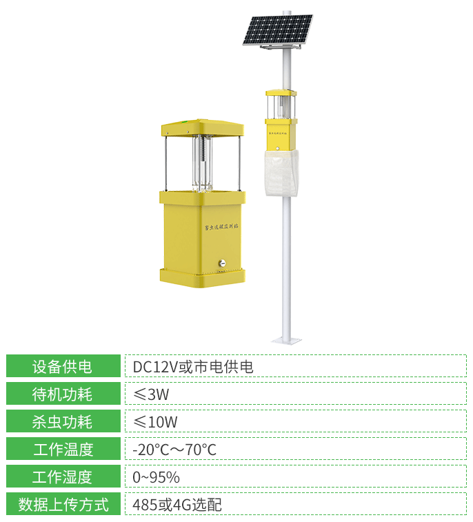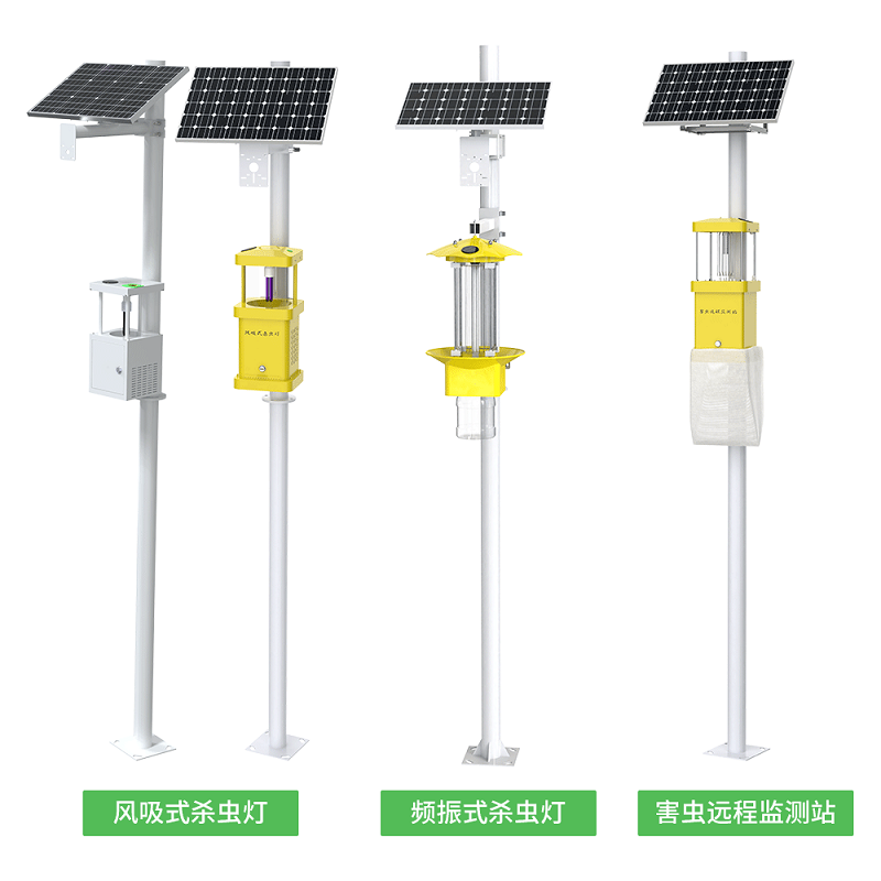 针对无需测报功能的日常使用场景,我公司推出了杀虫灯设备,其采用广谱(波长 320nm-680nm 多光谱诱虫光源)诱虫方式,拥有外配以频振高压电网触杀的 频振式杀虫灯 和利用风机转动产生负压气流将虫子吸入到收集器中,使之风干、脱水,达到杀虫目的的 风吸式杀虫灯,客户可按需选择。