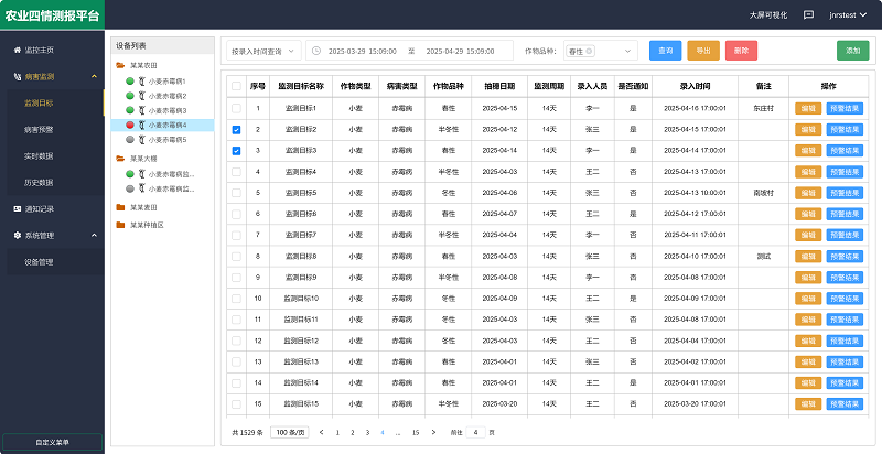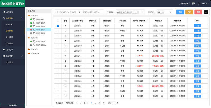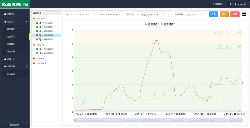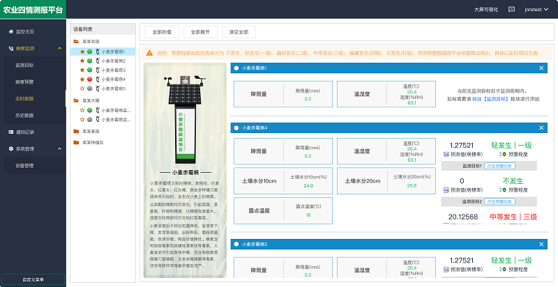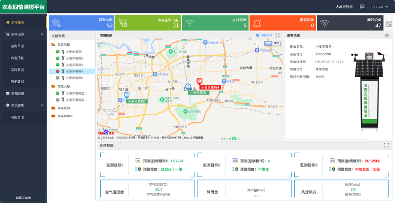 农业四情测报平台是馈用户的免费综合管理平台,其中 病害监测板块包括【监测目标】【病害预警】【实时数据】【历史数据】四个子版块,真正实现病虫害防控的智能化、协同化、高效化,为现代农业植保提供全方位的数据支撑。