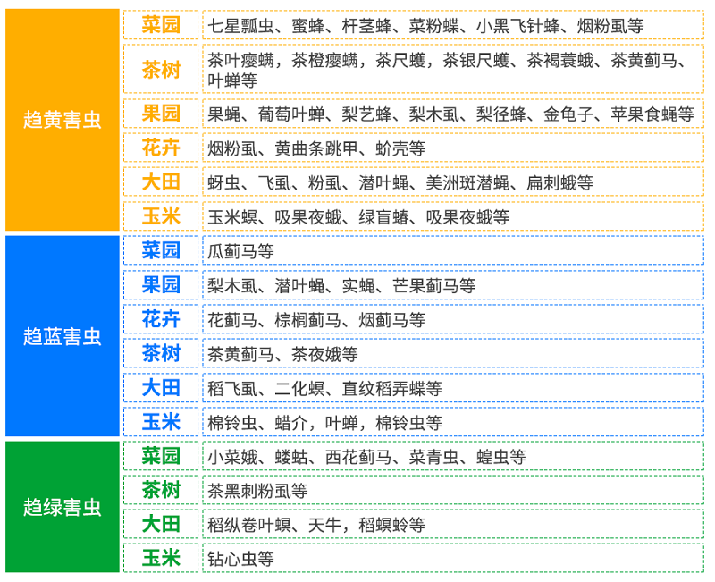 昆虫在长期的进化过程中产生了对色彩的趋性,也称为“色觉”。这类害虫多在白天活动,不同害虫对色彩的趋性也有特定的选择和爱好,且不同性别和发育阶段均可有差异。