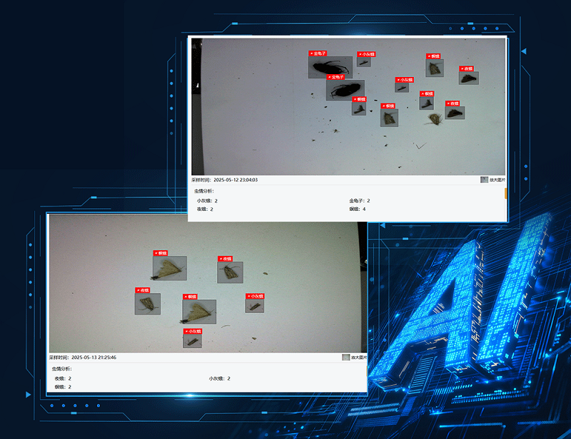2- 结合AI图像优化算法,消除运动拖影,实现虫体高清还原;数据库上万害虫模型对比,可自动标注害虫种类并分类计数;解决了传统虫情监测依赖人工目视判别,存在夜间无法作业、微小虫体漏检、种类误判率高等痛点。