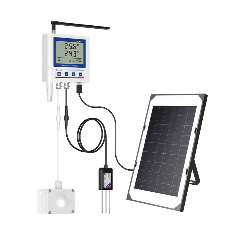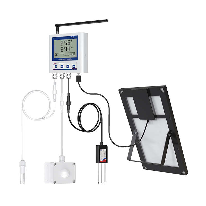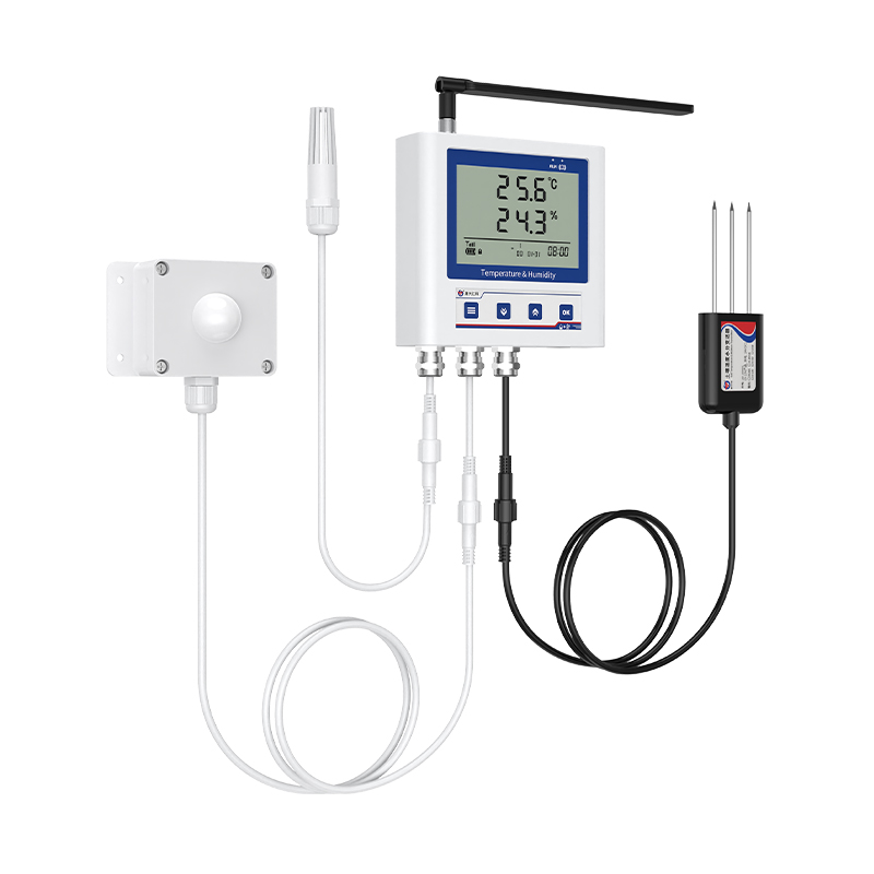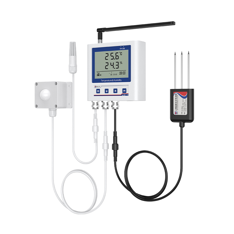 产品采用大屏液晶显示,可同时实现空气温湿度、土壤温湿度、光照度以及二氧化碳浓度的多参数监测,并且能够实现上下限双控,上下限值可自由设置,多参数可校准,4G数据传输等功能,内部集成报警功能模块(蜂鸣器),可实现各参数超限时报警。智能温室多参数传感器多种监测要素集成使用可以帮助实现更加精细化、科学化的温室管理。