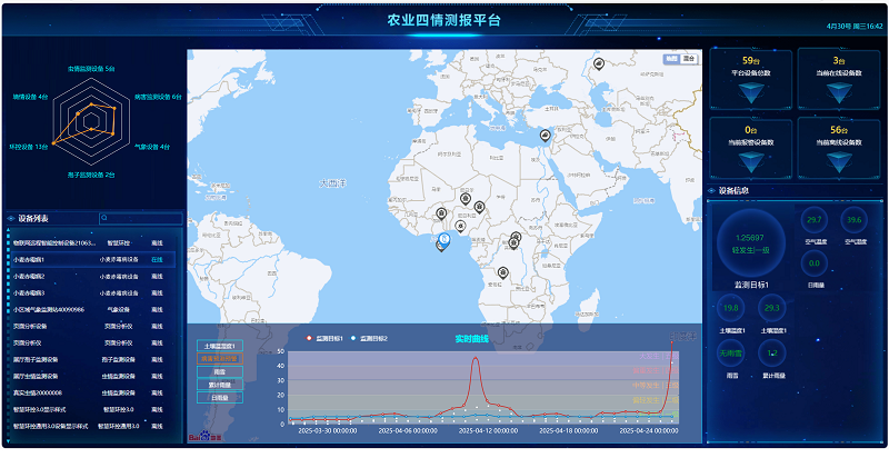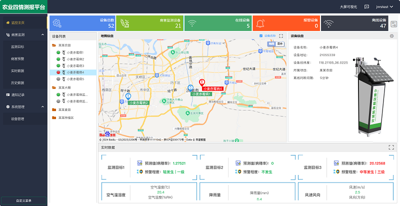农业四情测报平台是馈用户的免费综合管理平台,其中 病害监测板块包括【监测目标】【病害预警】【实时数据】【历史数据】四个子版块,真正实现病虫害防控的智能化、协同化、高效化,为现代农业植保提供全方位的数据支撑。